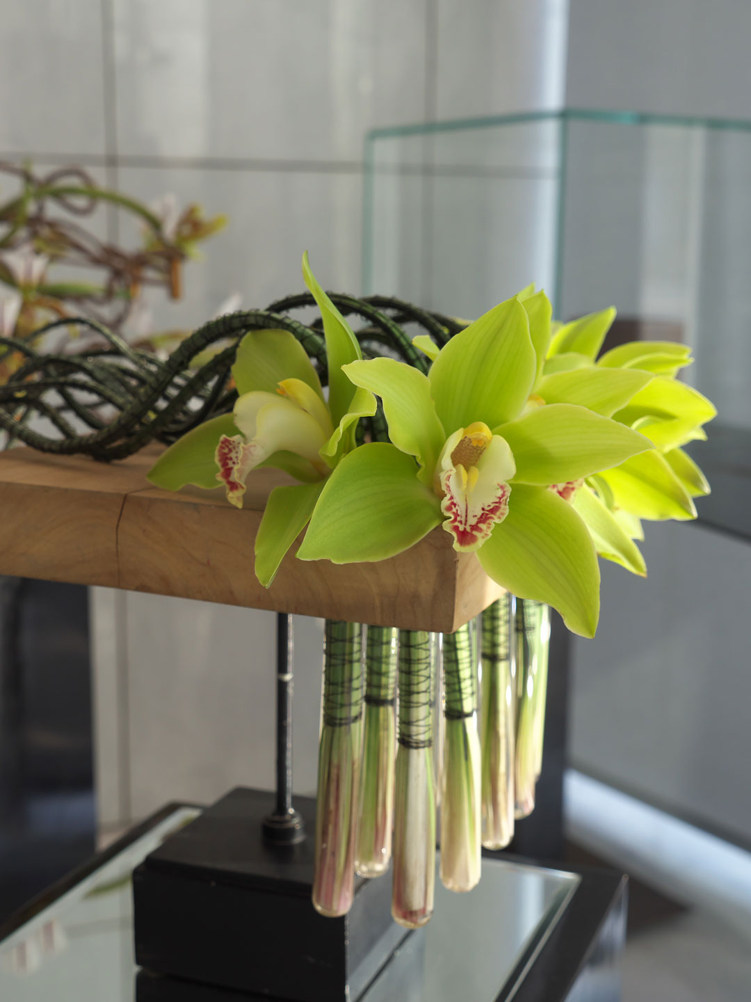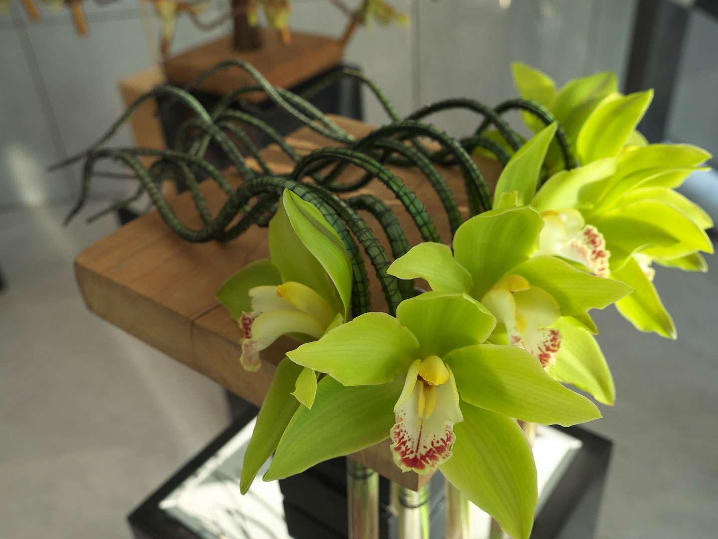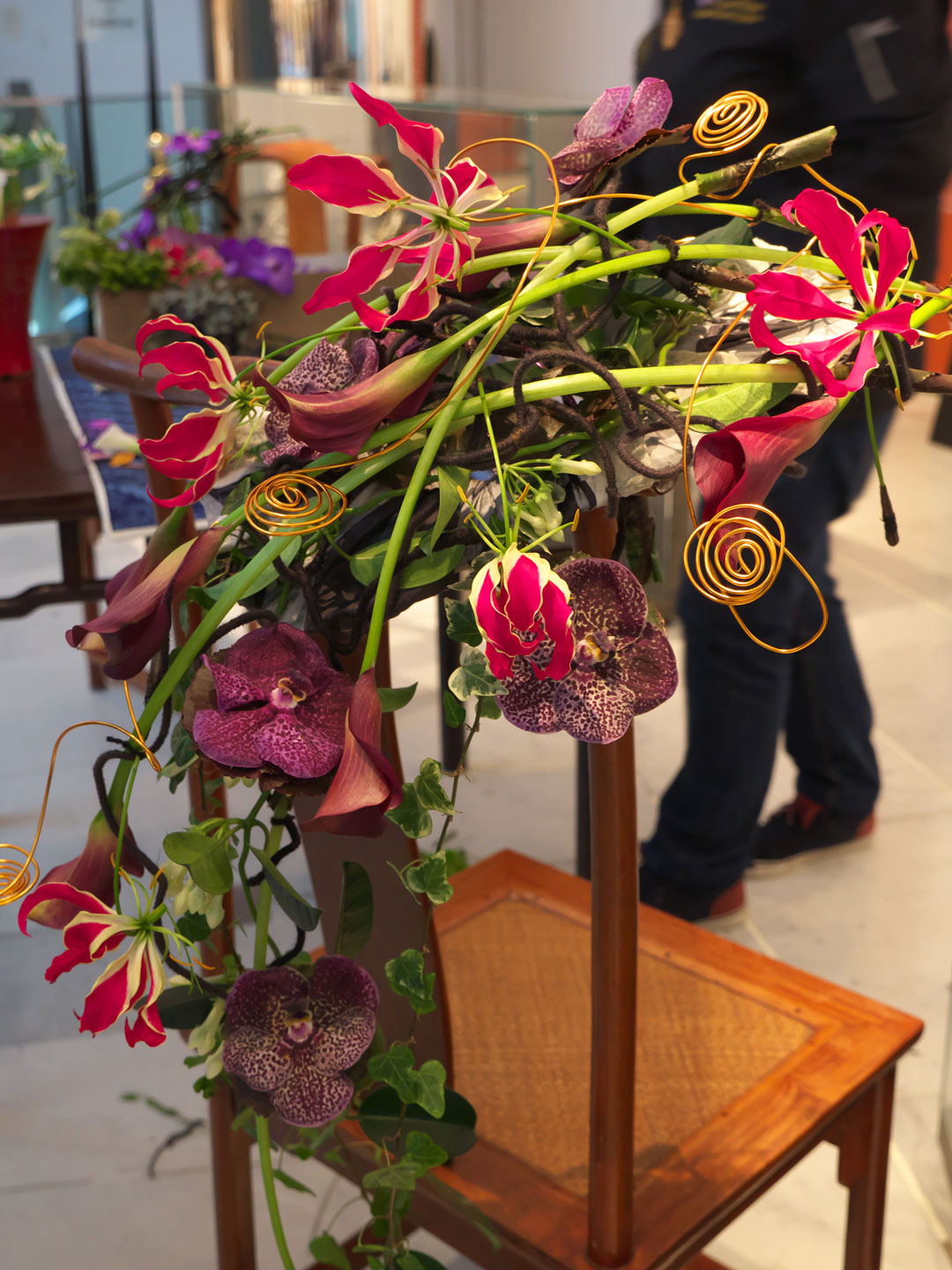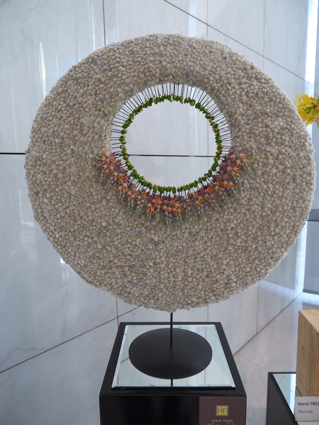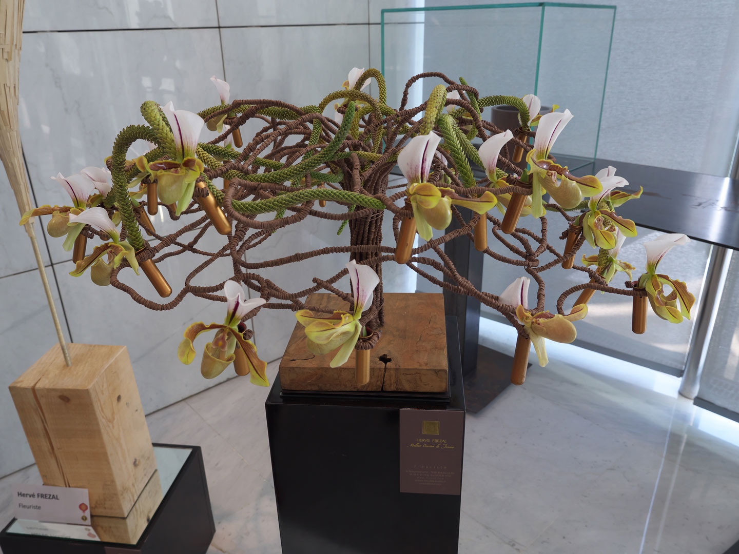 Comme vous pourrez le constater sur les photographies, Hervé FREZAL a bien su capter le thème de l’Asie dans ses compositions florales en jouant des contrastes de texture et de couleurs. La composition ronde de part sa texture cotonneuse et blanche laisse à penser de loin qu'il s'agit de céramique mais les petites fleurs de couleurs vives rappelent qu'il s'agit bien d'une composition florale. Pour celle basée sur un assemblage de lamelle de bois, là aussi on a un contraste entre le bois lisse et les fleurs texturées en étoile jaune. La composition avec des orchidées, leur texture lisse contraste avec des tiges hérissées et rugeuses ou entourées de métal pour leur donner forme et tenue. Assurement un bel assemblage qui montre que le fleuriste a su profiter de ses nombreux voyages à l'étranger pour y trouver des fleurs et idées variées.