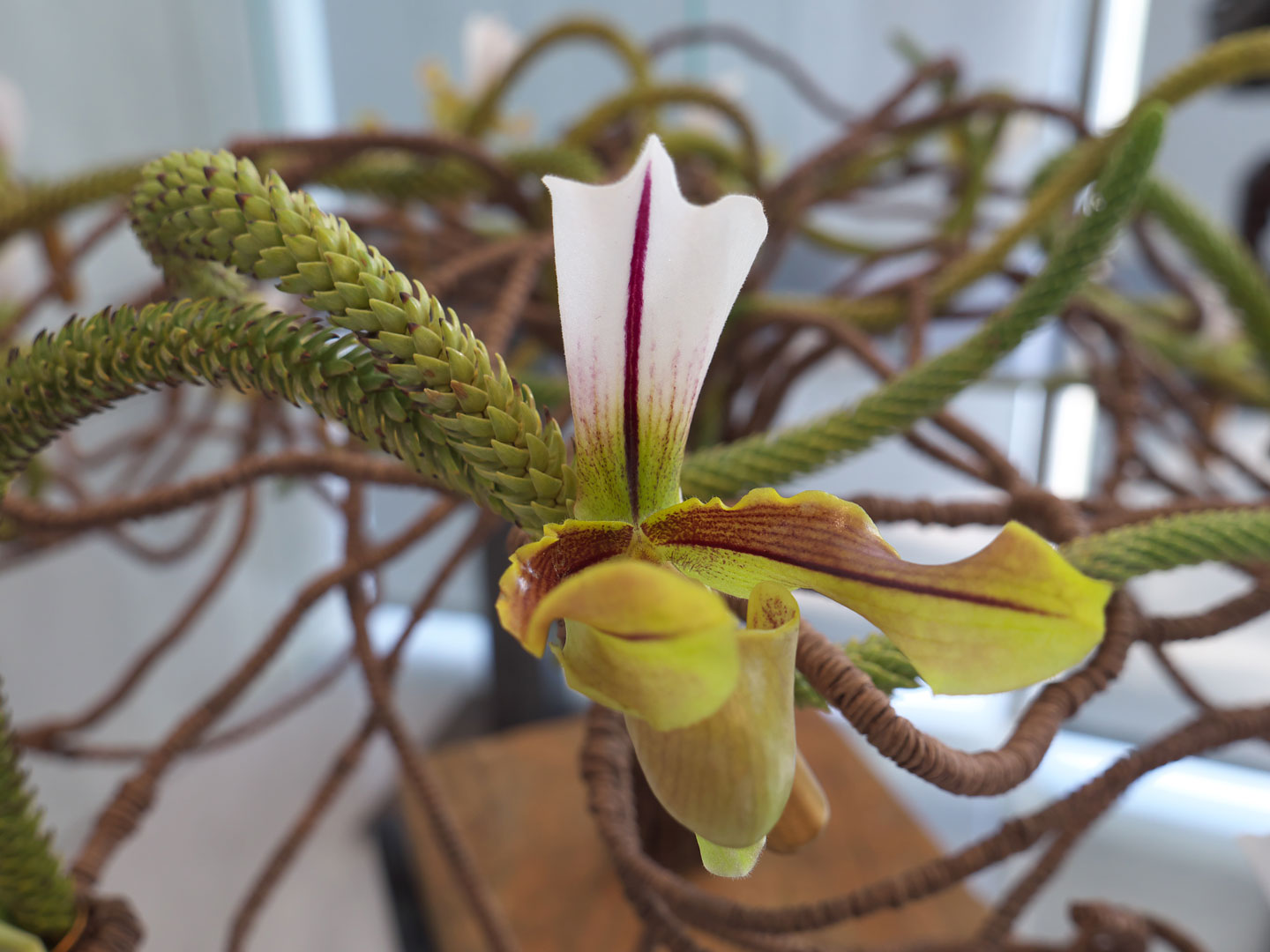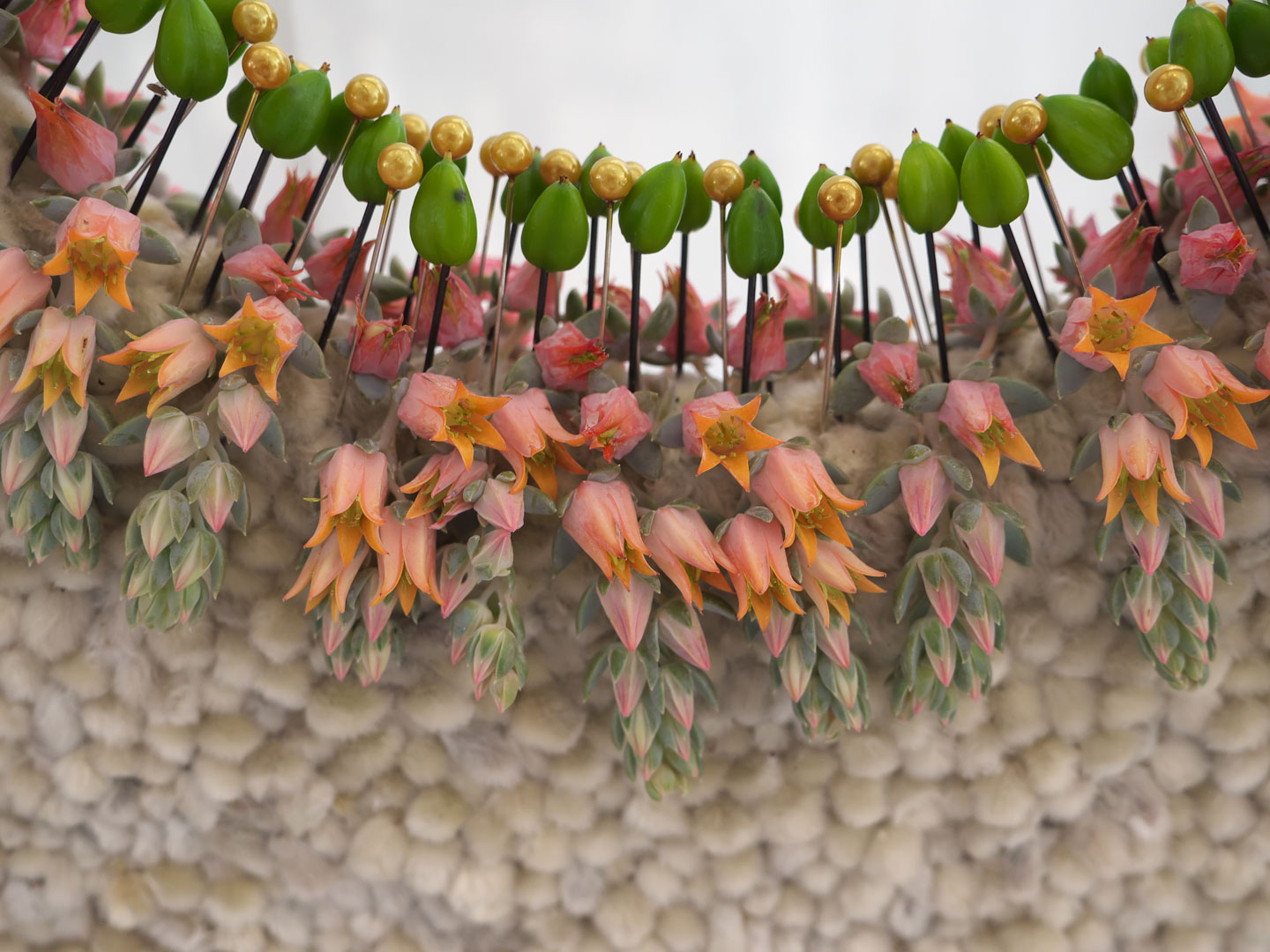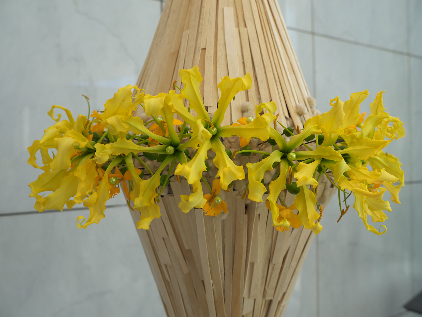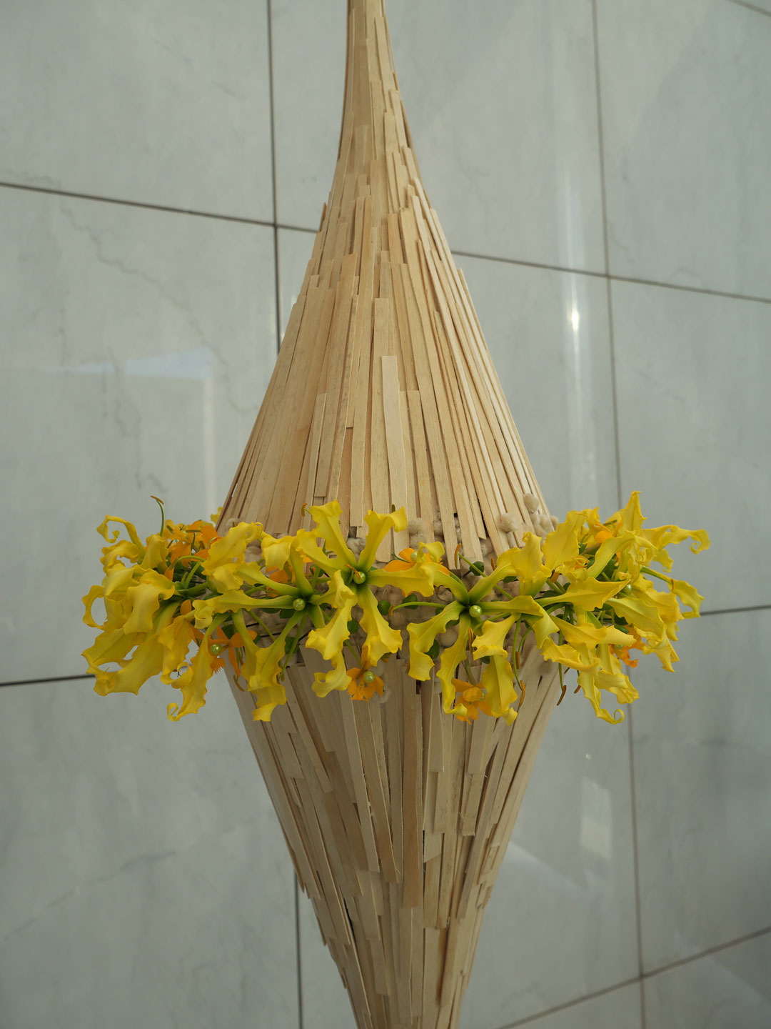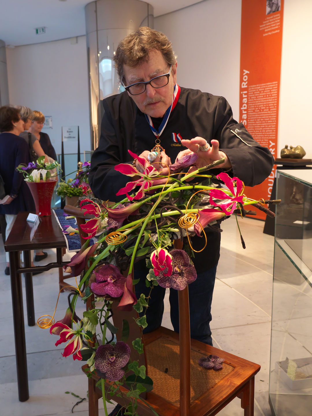 Daniel PICHON a choisi de réaliser sa composition dans le musée des Arts asiatiques pour montrer sa contruction progressive aux visiteurs. Un vrai travail d'équilibriste et une manipulation brin à brin des tiges pour leur associer des bijoux.