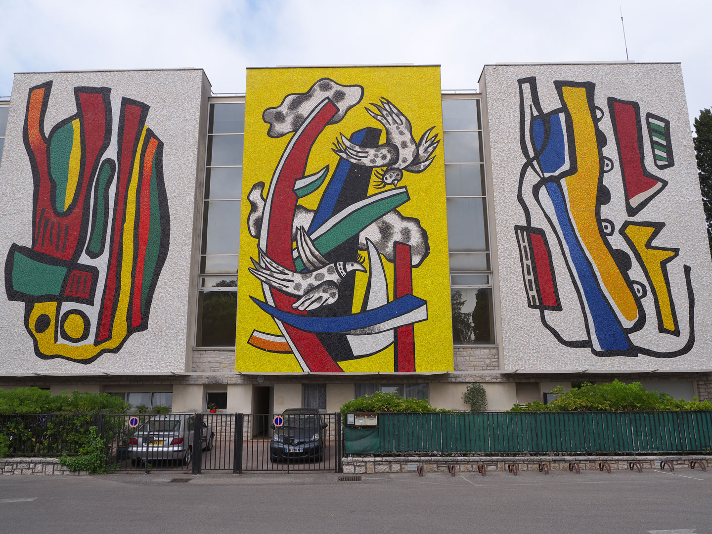 Appelés par Nadia Léger, Heidi et Lino Mélano quittent la cité d'artistes, La Ruche, à Paris pour descendre à Biot pour réaliser les travaux de la façade sud entre 1957 et 1960. Ce sont eux qui réalisent, associés avec Luigi Guardigli, la mosaïque multicolore monumentale (400 m2), combinant tesselles de pierre naturelle et de verre coloré en motifs abstraits. Celle ci est complétée par deux haut-reliefs de céramique noire et blanche signés de Roland et Claude Brice qui évoquent le thème du sport (jeu de ballon et vélo). Ces reliefs s’inspirent d’un projet non réalisé de Fernand Léger pour le stade de la ville d'Hanovre.