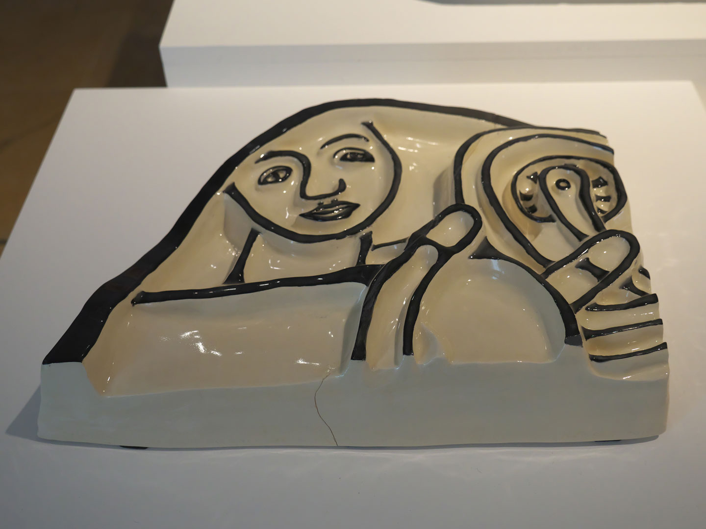 “Le musée nous a confié un moule, la tête du cycliste, nous avons monté deux équipes de trois élèves pour réaliser une oeuvre pour l'inauguration. Le travail a consisté en quatre étapes pour obtenir la pièce souhaitée. La première étape consiste à creuser la terre crue et sculpter le motif d'après un dessin puis d'attendre son séchage. La deuxième étape est la réalisation d'un moule à partir de la pièce en terre crue séchée à l'aide d'un coffrage et d'un coulage de plâtre. La troisième étape revient à faire un tirage d'un biscuit obtenu par estampage dans le moule (on repousse la matière avec ses doigts dans le moule). Un autre tirage par coulage a aussi été réalisé pour montrer aux élèves deux techniques différentes. Le biscuit est obtenu en cuisant la terre dans un four à 1000°C. Il convient de vérifier les dimensions de chaque pièce car il y a une rétractation du biscuit à la cuisson. La quatrième étape permet d'obtenir la pièce finie après un émaillage du biscuit par une application des émaux noir et blanc et une cuisson pour l'émaillage dans un four à 970°C. La montée et descente de la température doit être lente pour éviter les chocs thermiques. Le four n'est ouvert qu'après refroidissement.