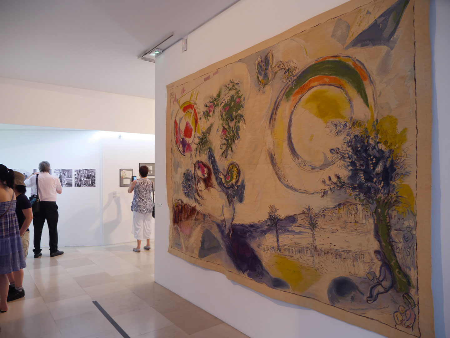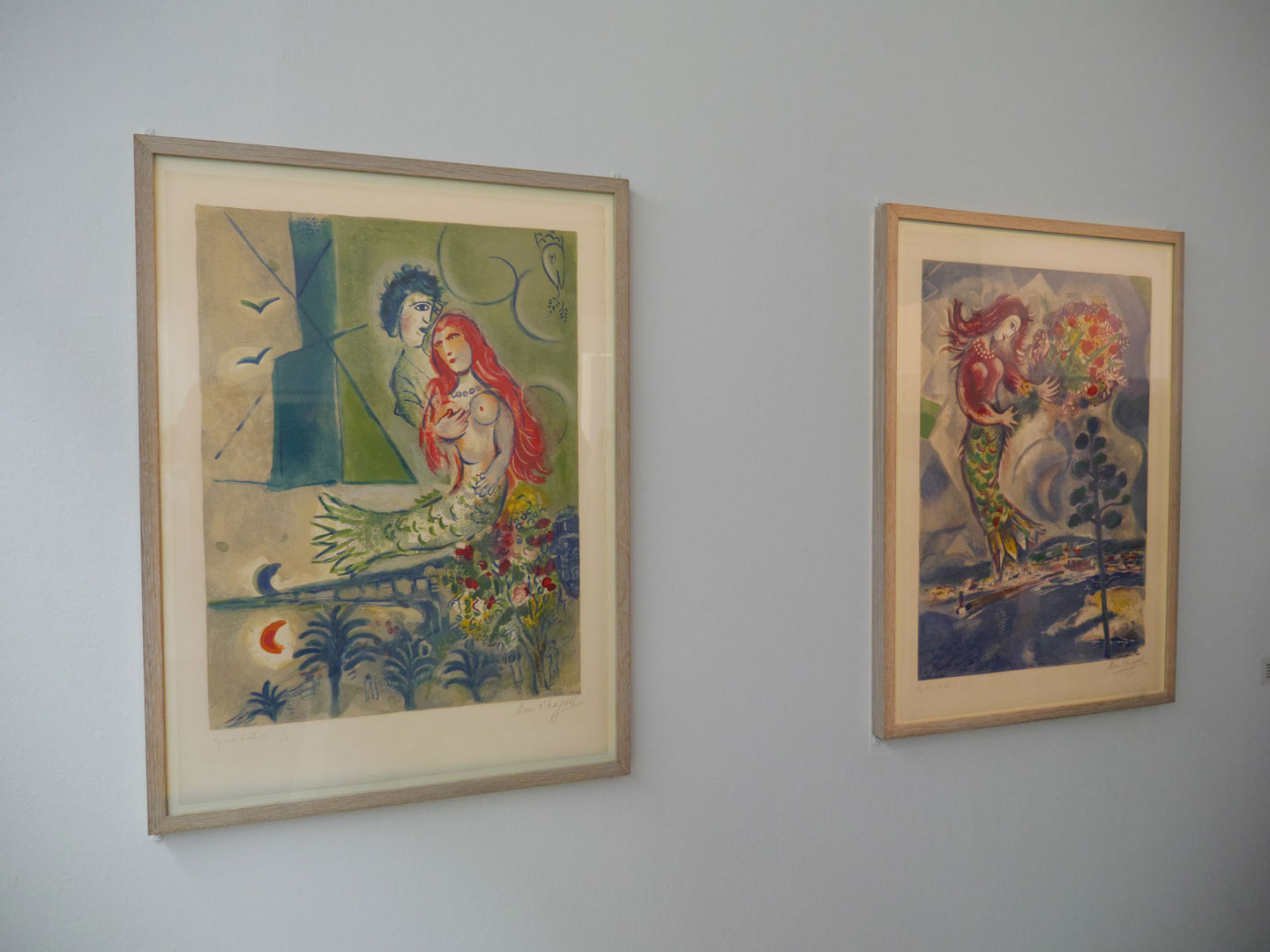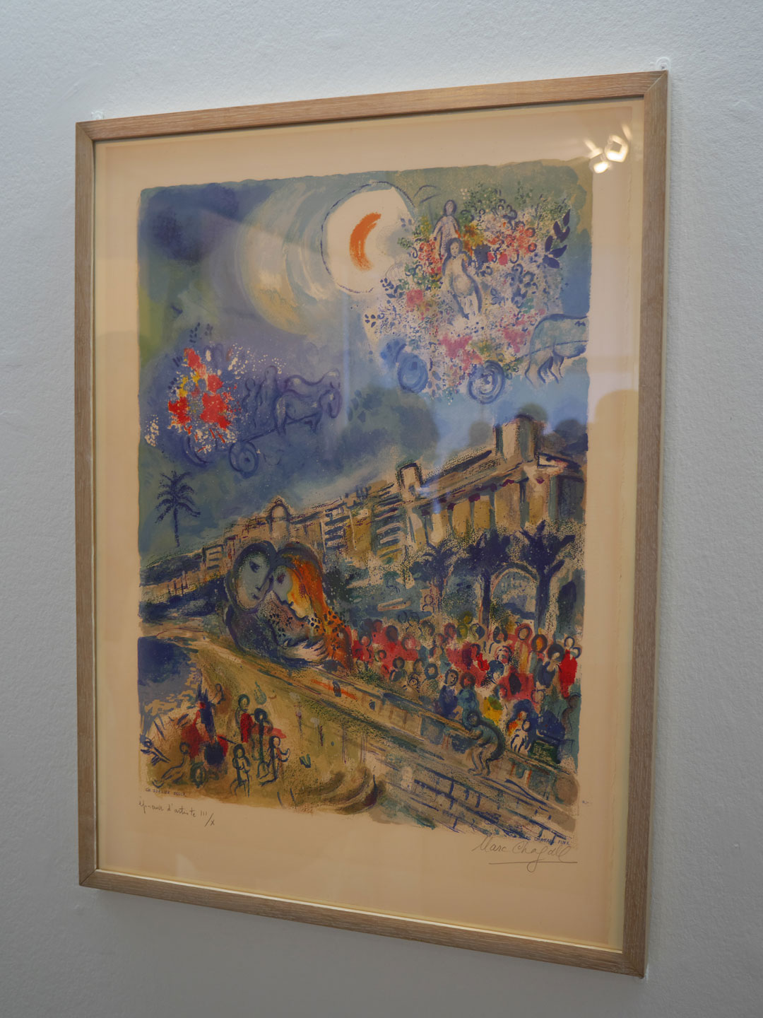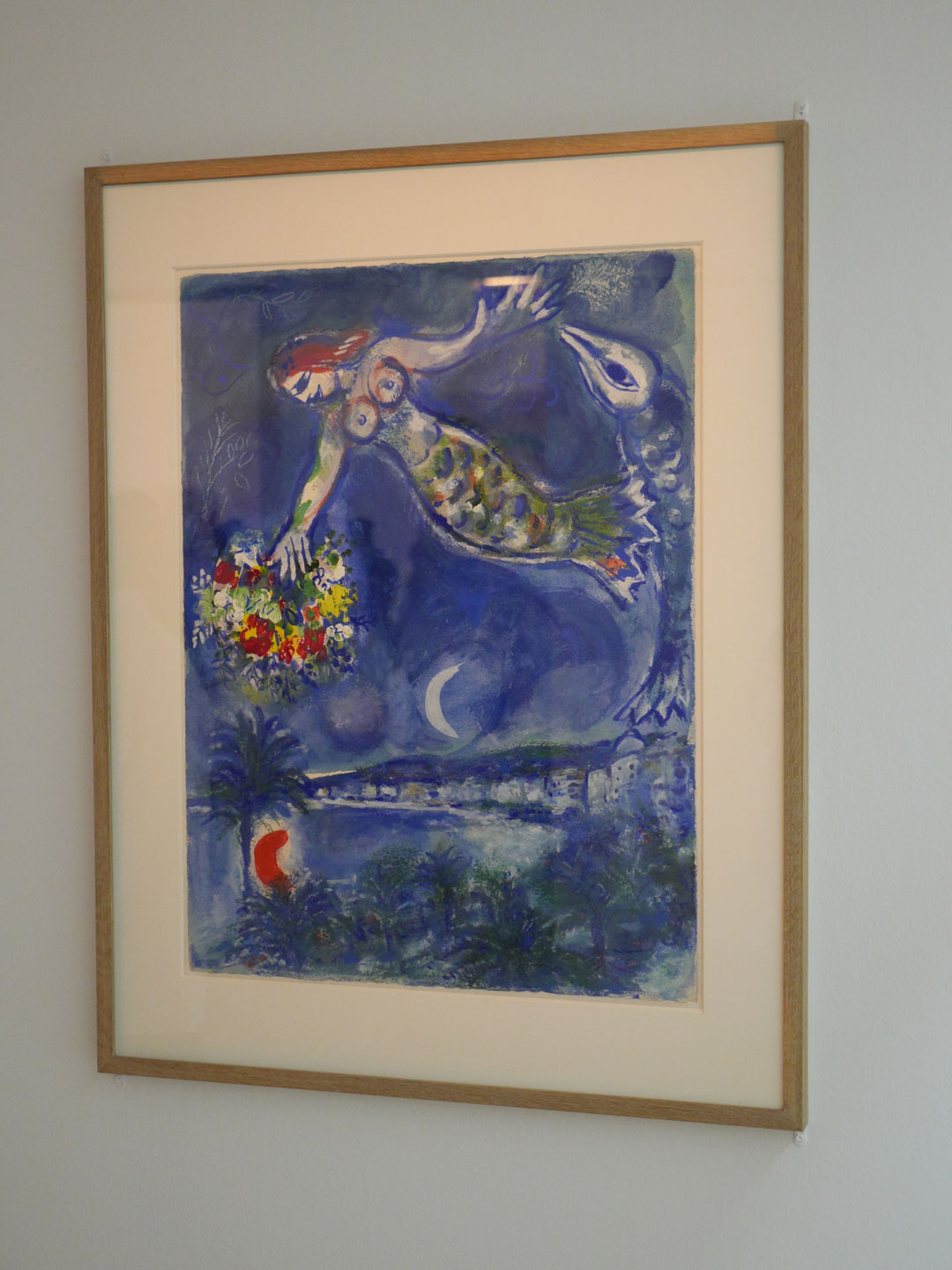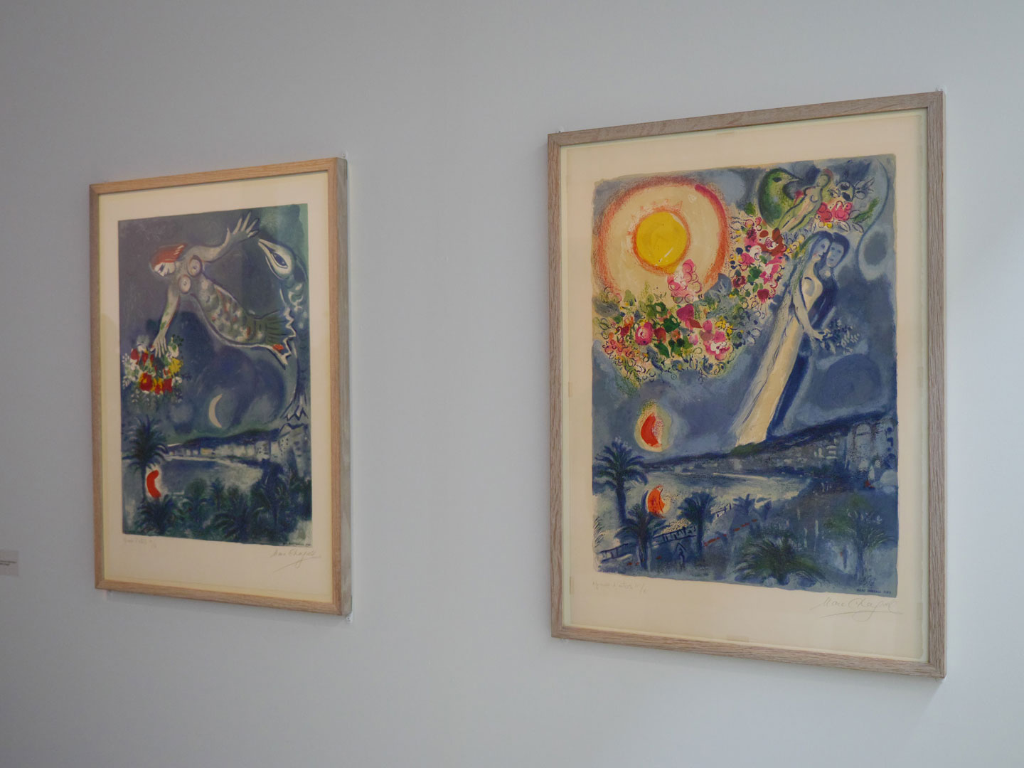 Devenue célèbre par sa très large diffusion, la lithographie « La baie des Anges » a servi de modèle pour la réalisation d'une tapisserie par Yvette Cauquil-Prince en 2003. Celle ci est présentée dans la même pièce de l'exposition pour mieux faire ressortir leur sujet commun et leur différences (la tapisserie est plus contrastée). Maître d'oeuvre virtuose, Yvette Cauquil-Prince est l'auteur de nombreuses œuvres tissées d'après les créations de Marc Chagall.