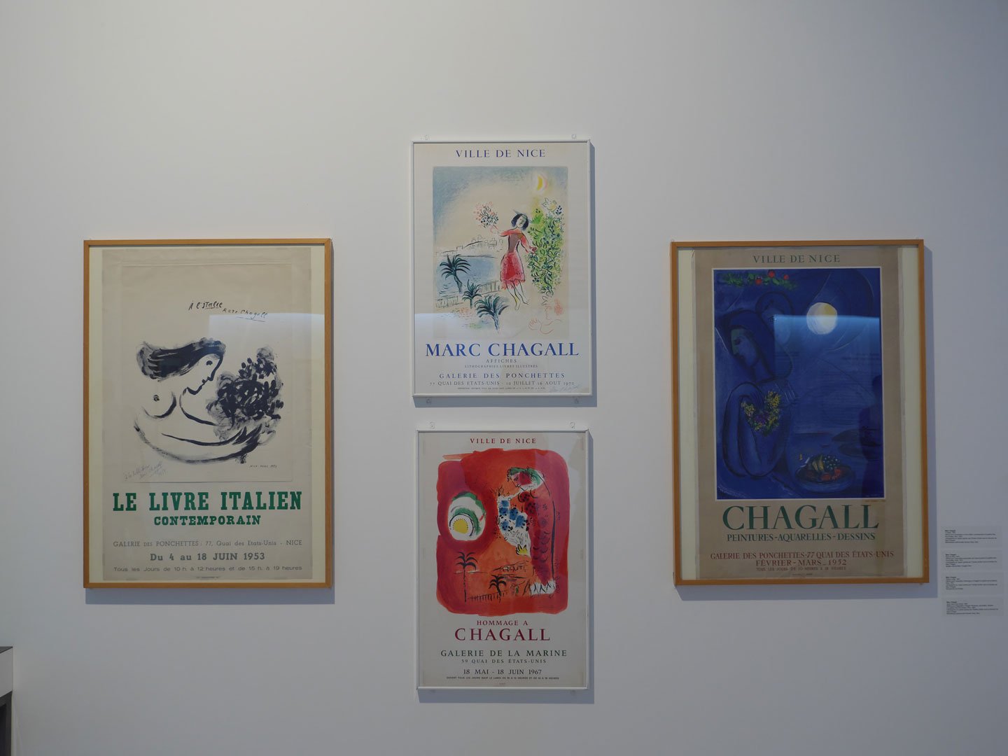 Lorsqu'il reçoit la commande d'une affiche pour Nice, Chagall exécute un remarquable ensemble de gouaches préparatoires aux couleurs éclatantes. Elles sont exposées en 1962 au musée Masséna de Nice. Les gouaches sont ensuite transcrites en lithographies dans les ateliers Mourlot à Paris et sont publiées en 1967 sous le titre « Nice et la Côte d'Azur ». Quelques gouaches préparatoires sont présentées en regard des lithographies dont Nice constitue le motif principal. La Promenade des Anglais et la baie de Nice sont transcrites dans une palette éclatante et lumineuse. Différentes facettes de la ville sont évoqués. On y voit notamment la silhouette de monuments célèbres, comme l'hotel Negresco, le Palais de la Méditerranée et les édifices bordant la place Masséna. Le carnaval est lui aussi évoqué à travers ses illustres batailles de fleurs. Ces images de Nice sont traversées par les protagonistes du répertoire familier de l'artiste : couples d'amoureux, sirènes, bouquets de fleurs et poissons.