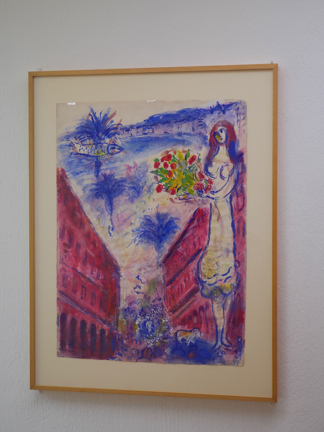 Lors de son discours de vernissage, madame Anne Dopffer nous a indiqué que l’exposition « Nice Soleil Fleurs. Marc Chagall et la Baie des Anges » propose un regard inédit sur les liens entre Marc Chagall et la ville de Nice. Elle permet notamment de découvrir le portfolio Nice et la Côte d’Azur, composé de douze lithographies réalisées en 1967 par Marc Chagall et qui sont autant de déclinaisons du motif de la baie des Anges. Œuvres et documents d’archives permettent de présenter un panorama de l’intérêt de Chagall pour la Promenade des Anglais, mais aussi de l’intérêt de Nice pour l’œuvre de l’artiste, qui a été exposée à plusieurs reprises à la galerie des Ponchettes et à la galerie de la Marine.