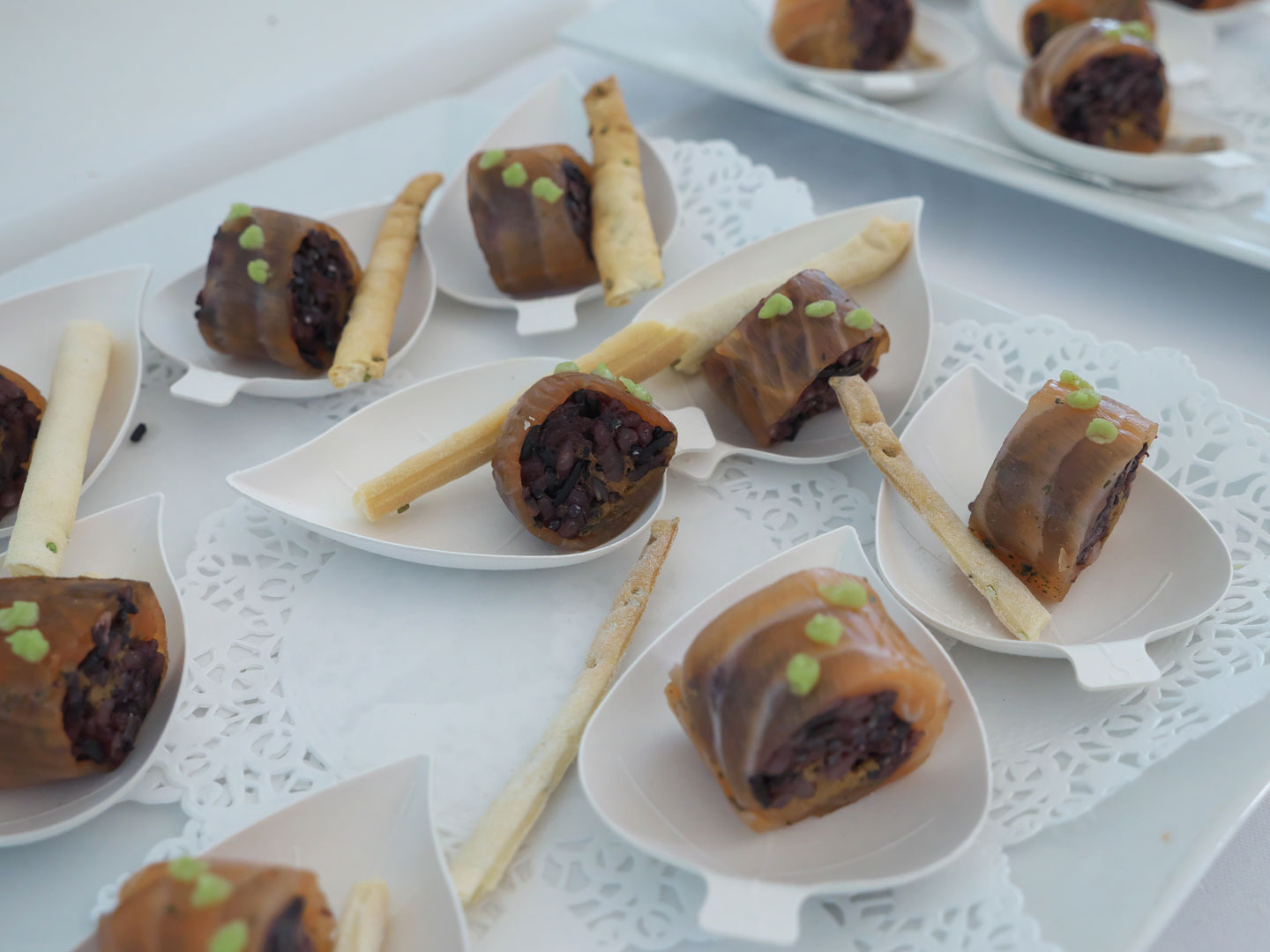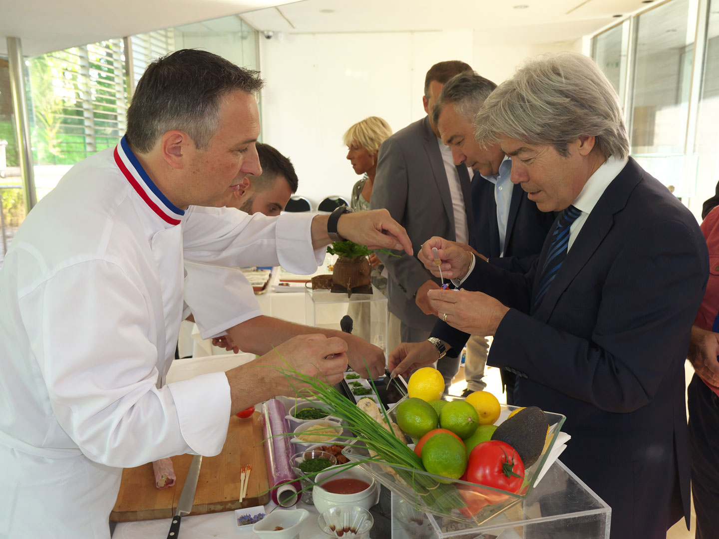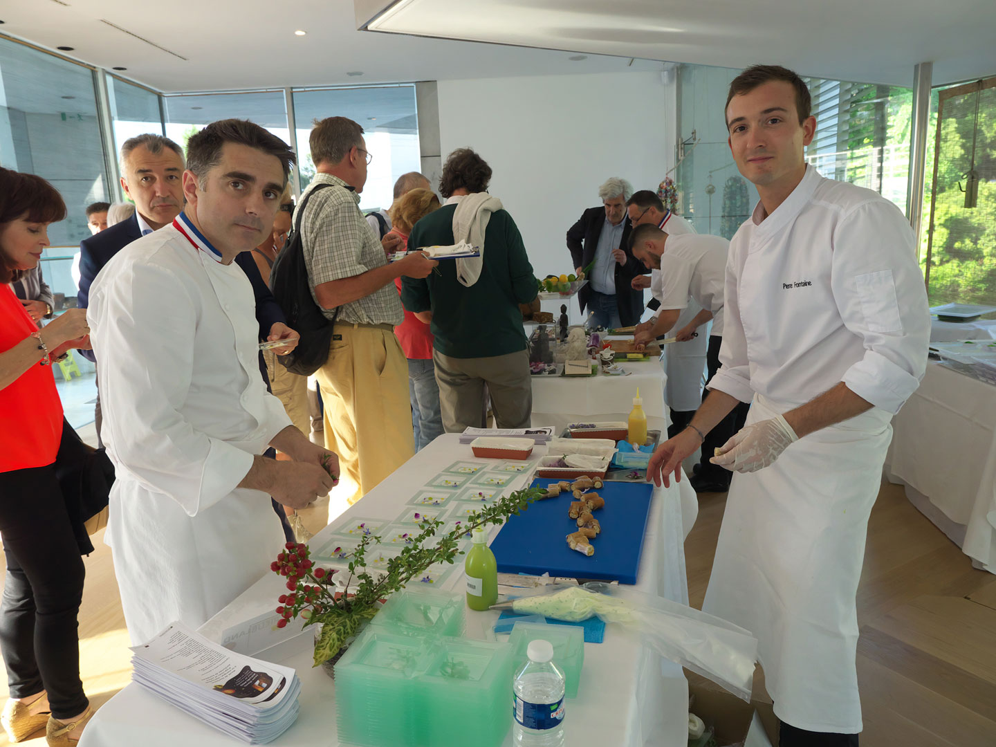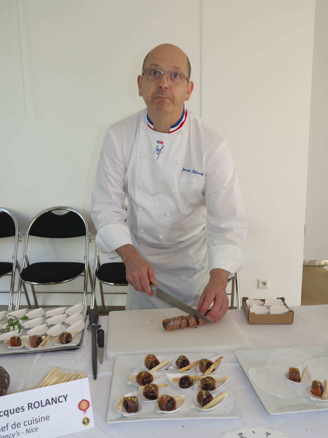 Jean-Denis RIEUBLAND, chef de cuisine au Negresco à Nice, Meilleur Ouvrier de France en 2007, avait préparé des « Roulés de tourteau, mangue verte, émulsion cambawa ». Une proposition riche en bouche. Il était venu avec Olivier NOVELLI, en charge de l’Art de la table au Negresco (Meilleur Ouvrier de France en en 2011), qui montrait son savoir faire dans l’agencement d’une table sur le thème de l'Asie.