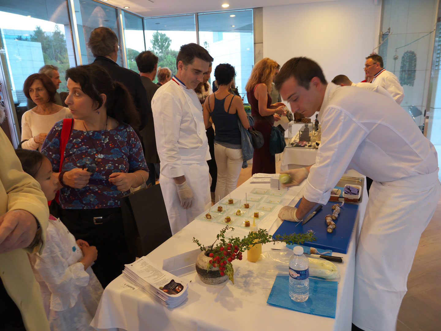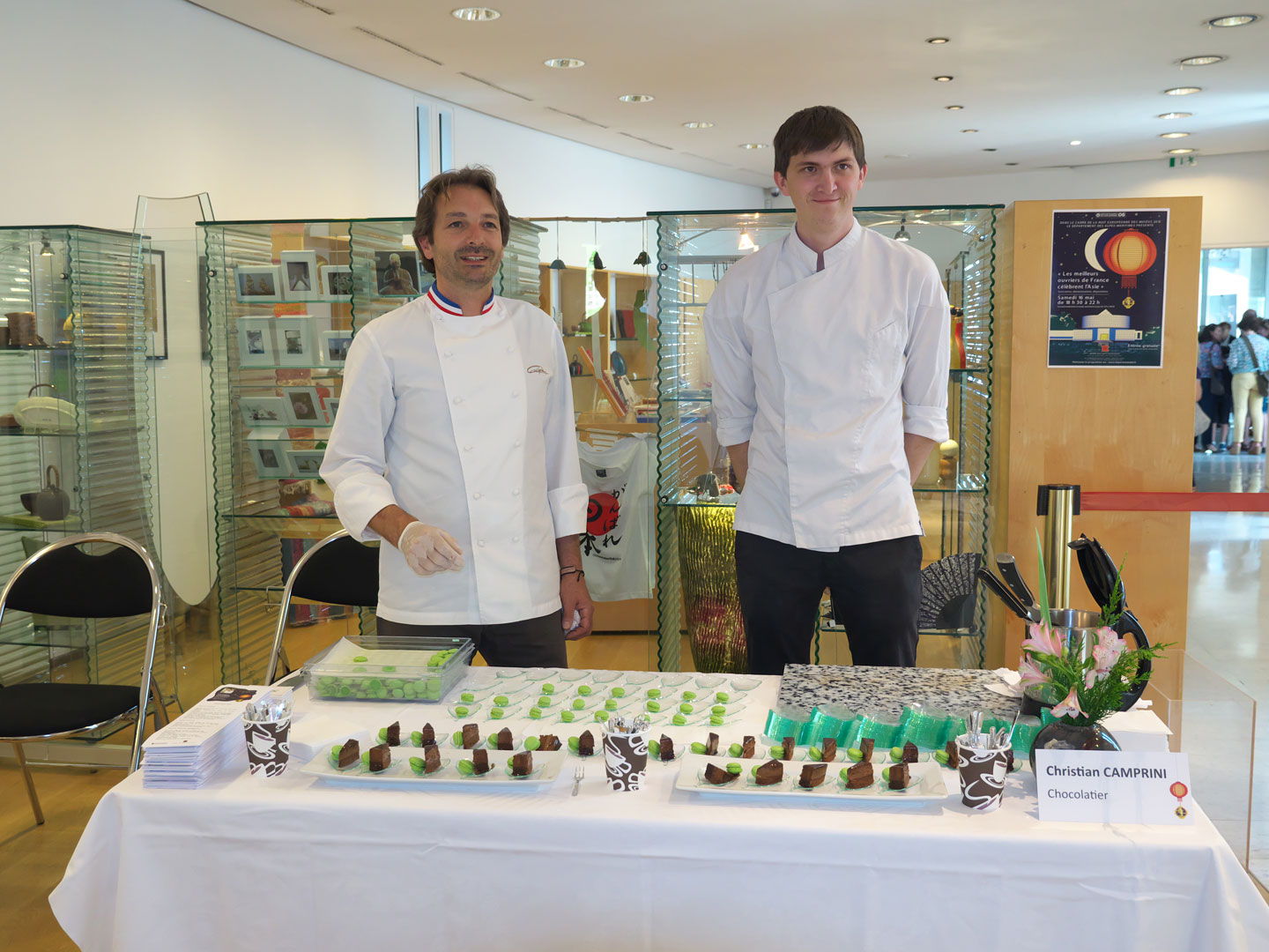 Pour montrer le savoir faire des Meilleurs Ouvriers de France des Alpes-Martimes, dans la catégorie des métiers de bouche, la crème des restaurateurs était venue au musée des Arts asiatiques de Nice. Le public présent pour la nuit européenne ne boudait son plaisir et il fallait attendre son tour pour arriver au niveaux des stands salés ou sucrés pour deux dégustations parmi les propositions des chefs.