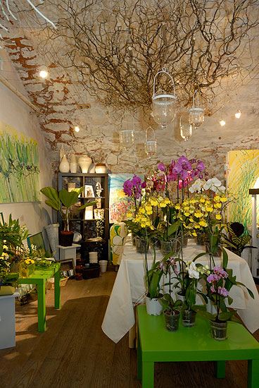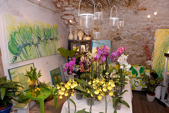 Le magasin BiotyFleur est situé comme nombre de galeries d’art de la place des arcades dans un magnifique sous sol vouté en pierre. Ce cadre minéral sert d’écrin à nombre de décorations florales.