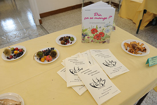 Maryse Romieu exposait le premier tome de son livre “DIS, ÇA SE MANGE ?”, édité par les éditions Serre. Ce livre, illustré de nombreuses aquarelles en couleurs, consiste en un petit inventaire de plantes comestibles et les manières de les accommoder.