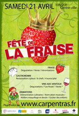 La Fête de la Fraise aura lieu à Carpentras le 21 avril 2012. Cette année, la fraise de Wepion et la Ville de Namur sont les invitées d'honneur. Venez profiter de cette journée par découvrir ou redécouvrir la qualité de la fraise de Carpentras en vente directe par les producteurs. Installez-vous et dégustez les entremets des chefs locaux que vous aurez choisis pour concocter votre repas.