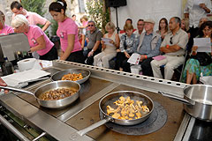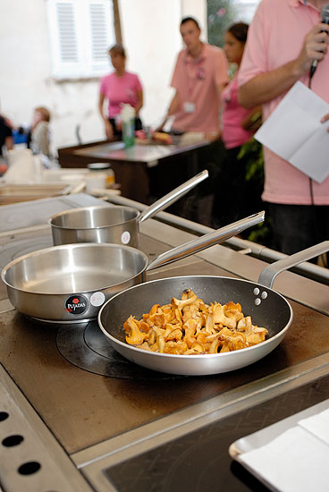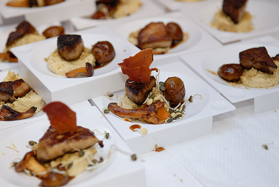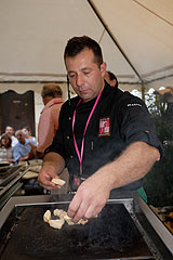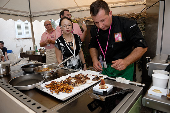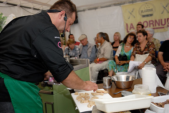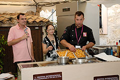 Hervé Klein est le chef du restaurant "Le flamboyant" à Riom (Puy de Dôme). Lors de sa venue au festival de gastronomie de Mougins, il nous a présenté, avec son assistante Elodie, une de ces recettes : "crème brulée foie gras, foie gras gras poelé lentilles germées, cèpes & chataignes poelées décoction de birlou". Jean-Michel Poupart, directeur du festival, commentait sa préparation. Hervé Klein est membre de Génération. C Cuisines & Cultures.