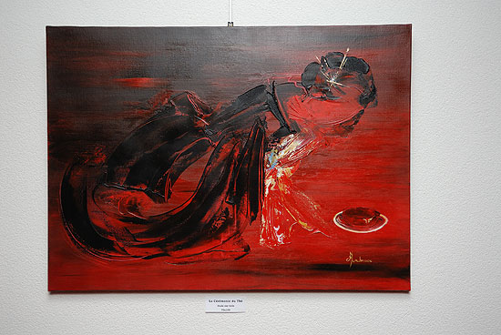 On pourra constater que les oeuvres exposées étaient d'un très bon niveau artistique et couvraient une large palette de styles. Nous avons particulièrement aimé le travail de Catherine FLAMBEAUX avec une maitrise du geste et une belle énergie dans les formes employées, les textures de peinture obtenues allant des aplats lisses aux formes les plus rugueuses. Le travail de SAD, alternant monochromes noirs ou tons rouges vifs est caractérisé par l'emploi de reliefs, d'ajout de matière aux toiles. Ce travail prends son plein essort avec une lumière douce et enveloppante.
