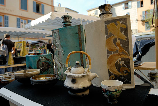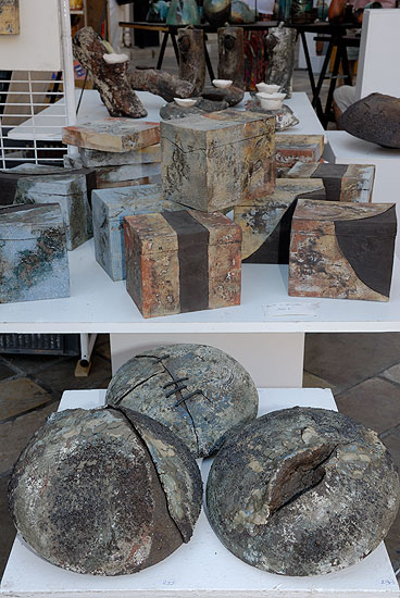 Le marché de potiers permettait de voir une production de céramiques variée : des pièces lisses ou en raku pour l'art de la table, des sculptures animalières, des personnages, ou des objets d'Art.