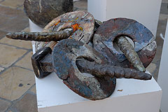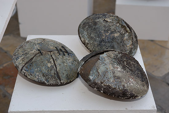 Pour finir, nous avons particulièrement apprécié le travail de Martine Adeline. L'utilisation d'objets à des tailles grande (clous et rondelles), des formes sphériques ou de boites à secret montraient une grande maîtrise de cet art : forme et texture, mélange d'acier et de céramique, aspect de fer, vernis dans les tons rouge orange.